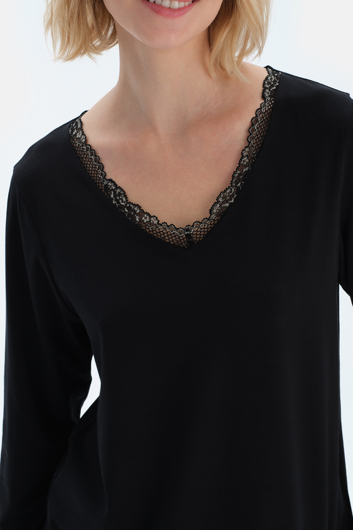Ensemble De Pyjama T-Shirt À Manches Longues Et Col En V Détaillé En Dentelle Femme Noir Noir